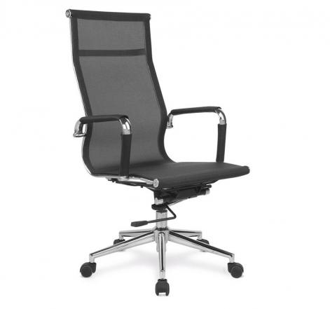 Cadeira presidente com encosto e assento revestidos em tecido telado de nylon, braços cromados com forração removível por meio de zíper, mecanismo relax com trava e base giratória cromada 320 mm com rodízios em PU.