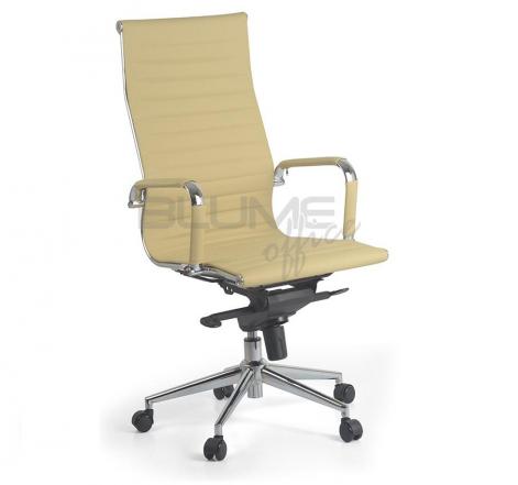 Cadeira presidente com encosto e assento revestidos em PU, braços cromados com forração removível por meio de zíper, mecanismo excêntrico* e base giratória cromada 320 mm com rodízios em PU.