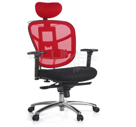 Cadeira presidente adaptável aos diferentes biotipos, com encosto em tecido telado de poliéster e assento revestido em tecido telado spacer com espuma semi-injetada, mecanismo A-Syncron*, chassis duplo em aço tubular cromado, pistão cromado, aranha 350 mm em alumínio e rodízios de PU. Regulagem de altura do encosto, sendo o acionamento por botão, com 6 posições de travamento. Assento com regulagem horizontal, que desliza por trilhos, sendo totalmente independente do encosto da cadeira. Braços com estrutura em aço cromado e apoio emborrachado, que proporciona maciez e conforto. Possui regulagem de altura com 6 posições, regulagem horizontal frente/trás e regulagem de abertura entre os braços. Tensor lombar para melhor apoio das costas. Encosto de cabeça com três regulagens: altura da estrutura, inclinação da estrutura e inclinação do apoio de cabeça.