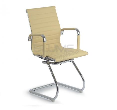 Cadeira de aproximação fixa com encosto e assento revestidos em PU, braços cromados com forração removível por meio de zíper, base ski cromada.