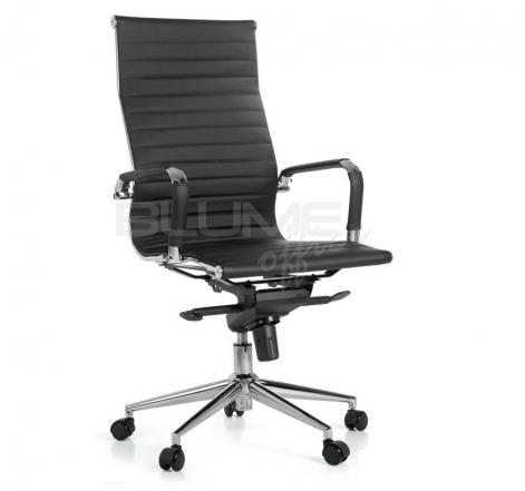 Cadeira presidente com encosto e assento revestidos em PU, braços cromados com forração removível por meio de zíper, mecanismo excêntrico* e base giratória cromada 320 mm com rodízios em PU.
