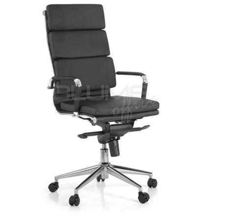Cadeira presidente com encosto e assento revestidos em PU, braços cromados com forração removível por meio de zíper, mecanismo excêntrico* e base giratória cromada 320 mm com rodízios em PU.