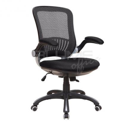 Cadeira diretor com encosto em tecido telado acrílico, assento em poliéster com espuma injetada, braços articuláveis em nylon, mecanismo A-Syncron* com trava em múltiplas posições, aranha 350 mm de nylon preta, pistão com capa em nylon e rodízios de PU.