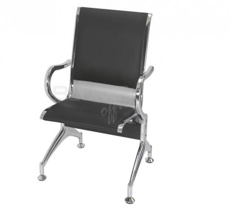Longarina com braços e pés cromados, acabamentos laterais do assento e do encosto cromados, pintura do assento e encosto em epóxi na cor cinza, sapatas reguláveis e estofamento em couríssimo na cor preta.