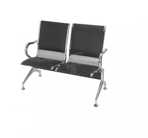 Longarina com braços e pés cromados, acabamentos laterais do assento e do encosto cromados, pintura do assento e encosto em epóxi na cor cinza, sapatas reguláveis e estofamento em couríssimo na cor preta.